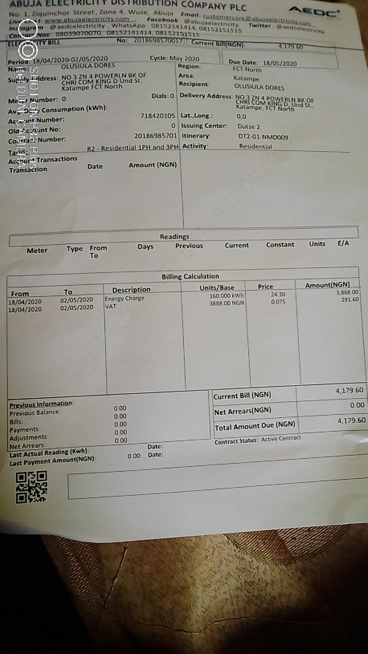 I managed to pay this bill because little money was still in my hands. Still believing that the three months free electricity will commence this month May 2020, but I was highly dumbfounded when Abuja Electricity Distribution Company (AEDC) agent brought me another bill of four thousand, one hundred and seventy-nine naira and sixty kobo (#4279.60) on 6th May 2020 in the morning, with a letter, see the bill and the letter here
