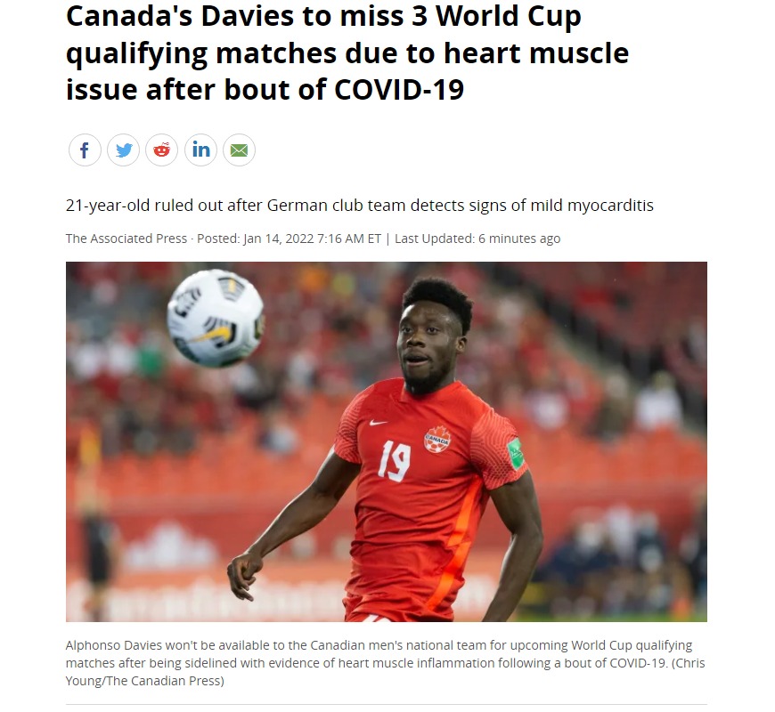 Fully Vaccinated Football Star ,Alphonso Davies, Develops Myocarditis. Possible End of Career
