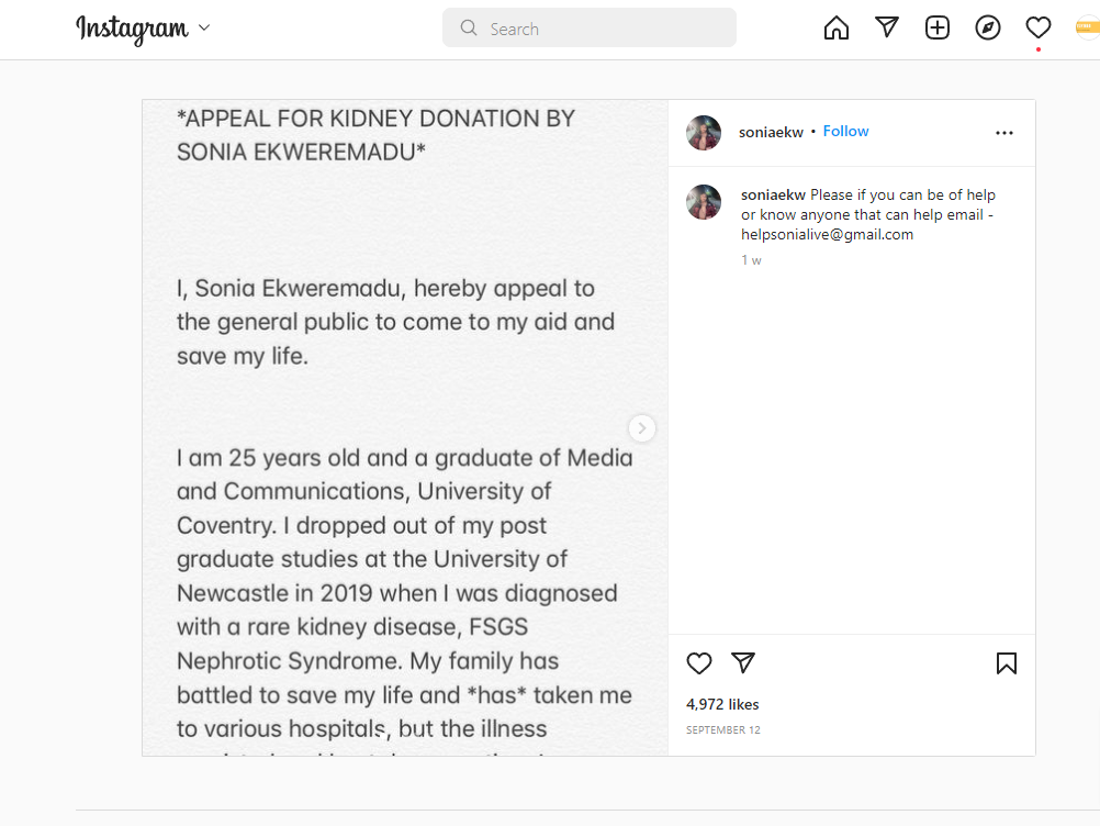The young lady, whose parents are presently facing indictments in the United Kingdom for organ harvesting, came to her Instagram page(Instagram | soniaekw) on Monday to make the appeal. She pleaded with the general public saying , "I, Sonia Ekweremadu, now appeal to the general public to come to my help and preserve my life."