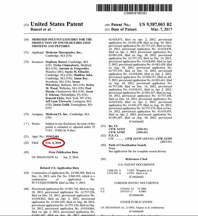 Analysis of the original Covid genome found the virus shares a sequence of 19 specific letters with a genetic section owned by Moderna, which has a total of 3,300 nucleotides.The US-based pharmaceutical firm filed the patent in February 2016 as part of its cancer research division, records show.The patented sequence is part of a gene called MSH3 that is known to affect how damaged cells repair themselves in the body. Scientists have highlighted this pathway as a potential target for new cancer treatments.Twelve of the shared letters make up the structure of Covid's furin cleavage site, with the rest being a match with nucleotides on a nearby part of the genome.