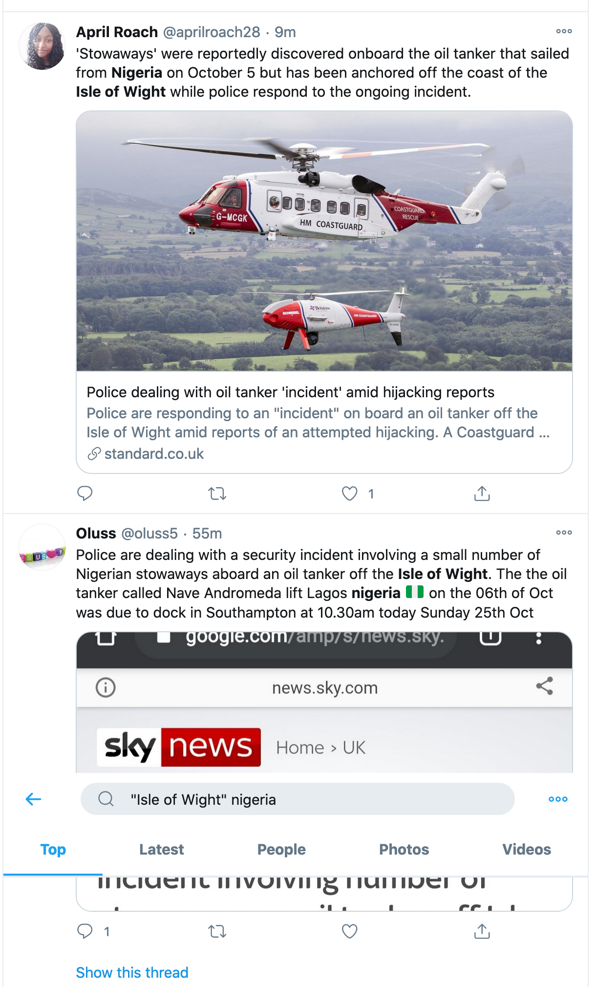 BBC is reporting that Seven illegal immigrants from Nigerians have taken control of the oil tanker Nave Andromeda, south off the coast of Isle of Wight. Anti-terrorist special operation is ONGOING! Stowaways' were reportedly discovered onboard the oil tanker that sailed from Nigeria on October 5 but has been anchored off the coast of the Isle of Wight while police respond to the ongoing incident.British Coastguard and police helicopter at the scene after the Nave Andromeda was hijacked, south of the Isle of Wight, earlier."British HM Coastguard & Hampshire Police, are dealing with an ongoing incident aboard a Liberian flagged oil tanker that has been forced to anchor off the Isle of Wight amid fears pirates have/ are trying to seize control of the ship."