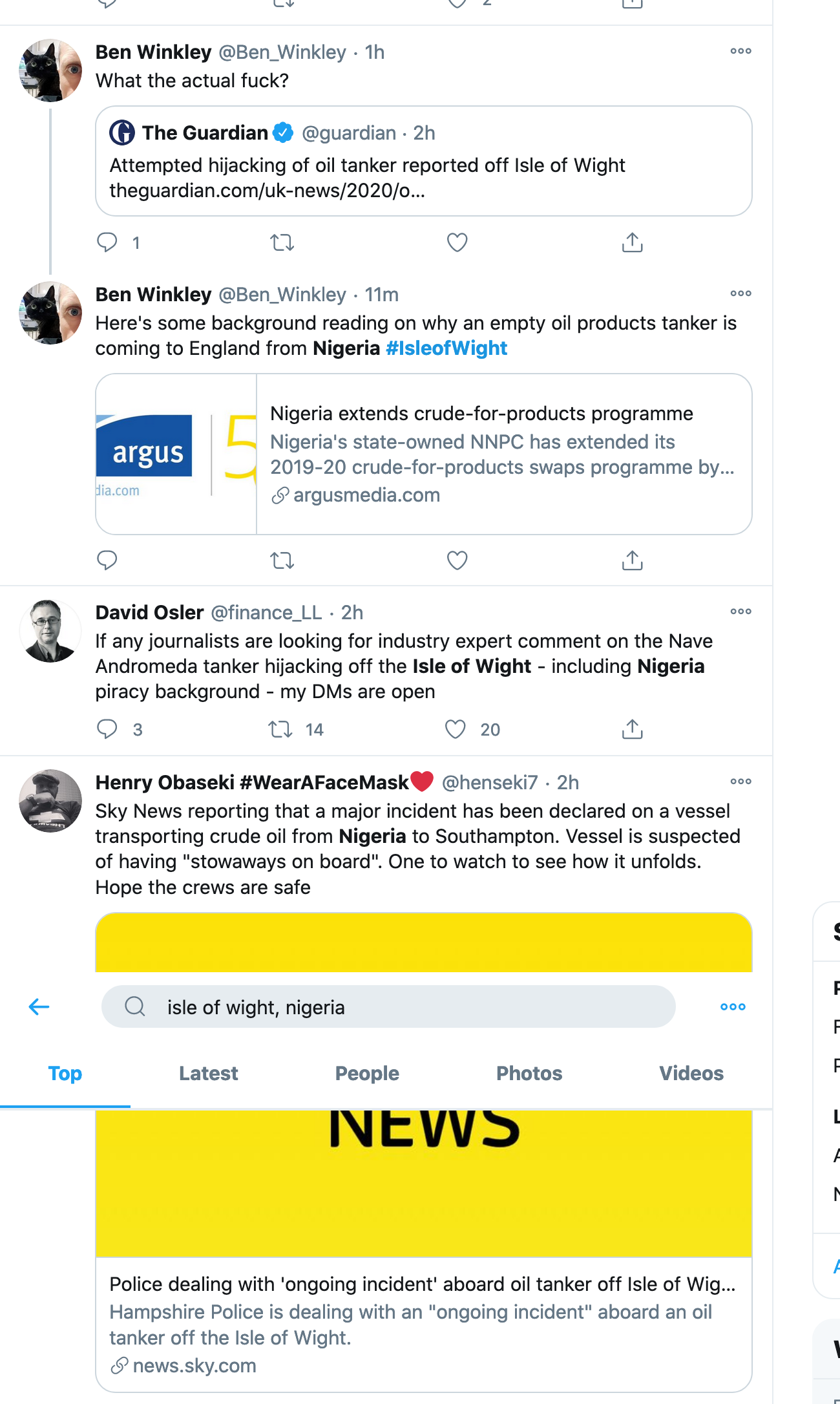 CONFIRMED – Seven illegal immigrants from Nigeria have been taken control of the oil tanker Nave Andromeda, south off the coast of Isle of Wight. Anti-terrorist special operation is ONGOING!#NaveAndromeda #UK pic.twitter.com/YnCjB6rAHu