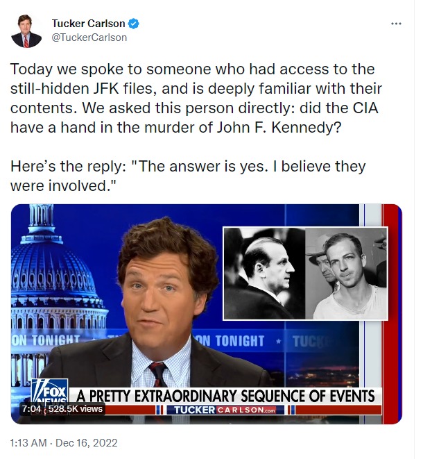 Carlson mentioned that people have been wondering about the assassination of John F. Kennedy ever since it took place. This is due to the fact that there were a lot of details that didn't add up or seemed like too much of a coincidence, and the CIA refused to release its documentation on the killing.Tucker Carlson posted in his twitter page ---