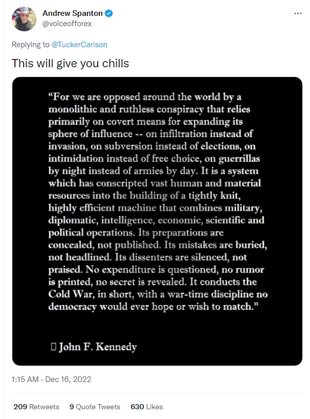 Here’s the reply: "The answer is yes. I believe they were involved." pic.twitter.com/3EURZcsaR2— Tucker Carlson (@TuckerCarlson) December 16, 2022